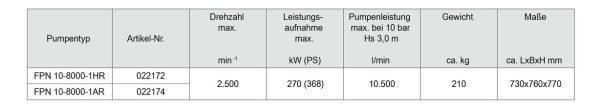 | FPN 10-8000-2HL | 270 kW (368 HP) | 10.500 lít/phút | 210 kg | 730 x 760 x 770 mm |